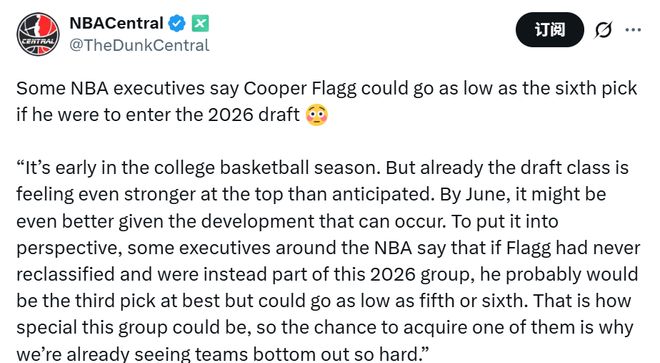 大学篮球赛季才刚刚开始,但这届新秀的头部战力已经超出预期。到明年6月选秀大会时,随着球员的持续成长,整体质量可能还会进一步提升。更直观的对比是,多位NBA球队高管表示,若弗拉格当初没有提前跳级,而是加入2026届选秀,他最多只能排到第3顺位,甚至可能跌至第5或第6顺位。这届新秀的实力之特殊,正是一些球队早早开始疯狂摆烂的原因。